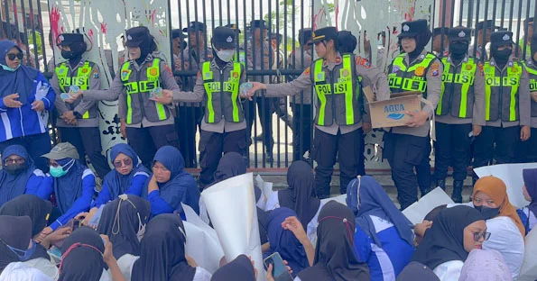 Di tengah kerumunan massa yang menyuarakan aspirasi mereka, tampak sejumlah Polisi Wanita (Polwan) dari Polres Bojonegoro Polda Jatim melakukan aksi simpatik dengan membagikan air mineral kepada para pengunjuk rasa.