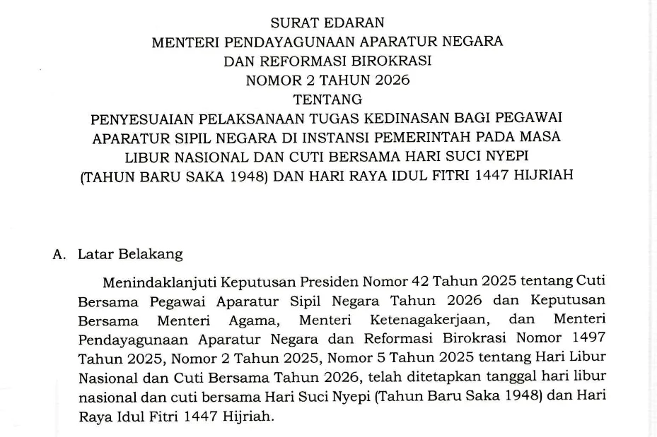 JAKARTA, 11 FEBRUARI 2026 – Pemerintah melalui Kementerian Pendayagunaan Aparatur Negara dan Reformasi Birokrasi (KemenPANRB) menerbitkan Surat Edaran (SE) Nomor 2 Tahun 2026 tentang penyesuaian pelaksanaan tugas kedinasan bagi Aparatur Sipil Negara (ASN) selama masa libur nasional dan cuti bersama Hari Suci Nyepi Tahun Baru Saka 1948 serta Hari Raya Idulfitri 1447 Hijriah.