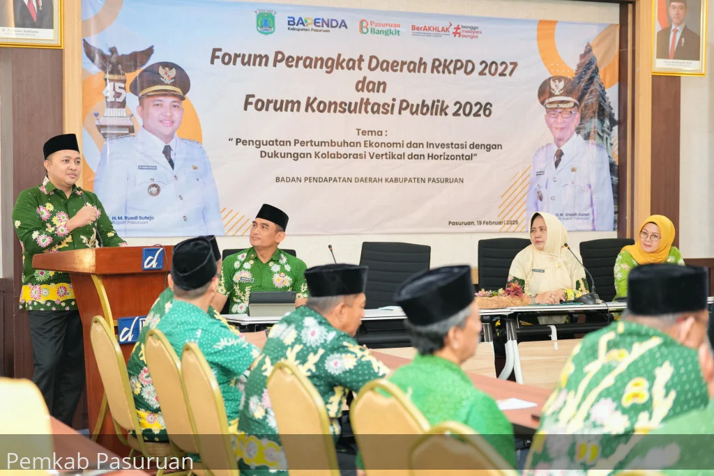 PASURUAN, 19 Februari 2026 – Bupati Rusdi Sutejo buka Forum Konsultasi Publik 2026 dan Forum Perangkat Daerah RKPD 2027 Badan Pendapatan Daerah Kabupaten Pasuruan siang ini (19/2/2026) di Hotel Dalwa Syariah Bangil.