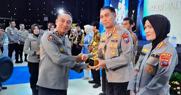 Penghargaan tersebut diserahkan langsung oleh Kadiv Humas Polri, Irjen Pol Sandi Nugroho kepada Kabid Humas Polda Jatim Kombes Pol Jules Abraham Abast, di sela kegiatan Sarasehan dan Dialog Kebangsaan yang digelar di Auditorium STIK Lemdiklat Polri, Jakarta, Kamis (30/10/2025).