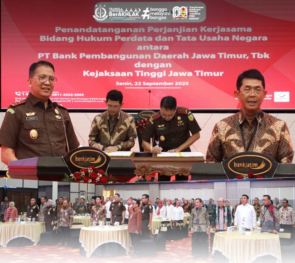SURABAYA, Selasa 23 September 2025 – Kejaksaan Tinggi Jawa Timur menjalin kerja sama dengan PT. Bank Pembangunan Daerah Jawa Timur Tbk. (Bank Jatim) dalam bidang Perdata dan Tata Usaha Negara melalui penandatanganan PKS di Kantor Pusat Bank Jatim, Surabaya, Senin (22/9/2025).