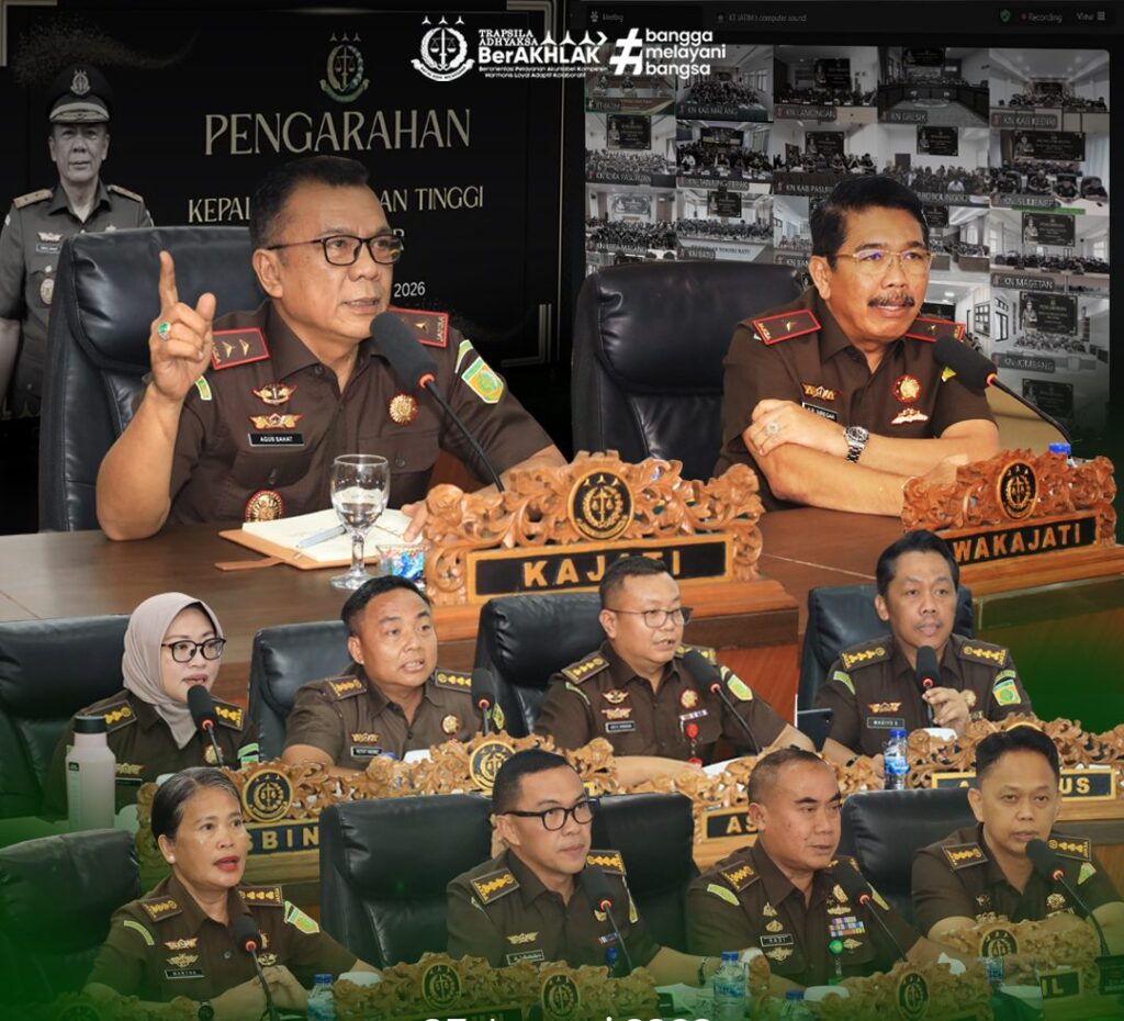 SURABAYA, Senin 05 Januari 2026 – Kepala Kejaksaan Tinggi Jawa Timur, Agus Sahat ST, S.H., M.H., memberikan pengarahan strategis kepada seluruh jajaran Kejaksaan Negeri se-Jawa Timur yang digelar secara virtual dari Ruang Rapat Kajati Jatim, Senin (5/1/2026).