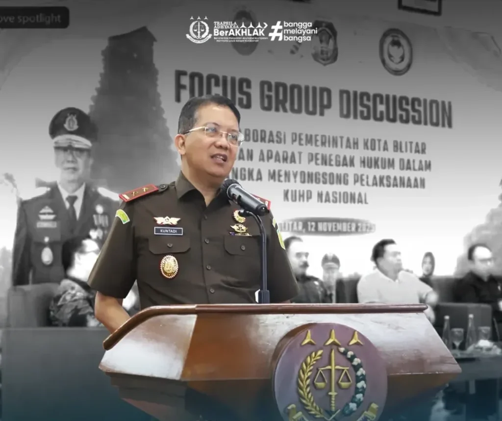 SURABAYA, Kamis 13 November 2025 – Kepala Kejaksaan Tinggi Jawa Timur, Dr. Kuntadi, S.H., M.H., menjadi keynote speaker secara daring dalam kegiatan Focus Group Discussion (FGD) yang diselenggarakan oleh Kejaksaan Negeri Blitar bersama Pemerintah Kota Blitar, Rabu (12/11/2025).